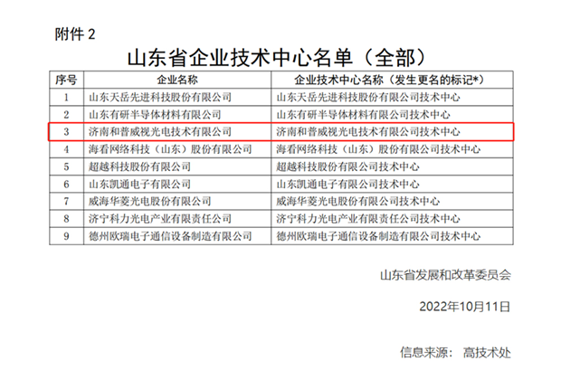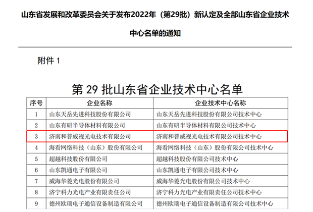 2022年10月11日,山東省發展和改革委員會發布通知:根據《山東省企業技術中心認定管理辦法(2021年修訂)》(魯發改高技〔2021〕428號),經審定,確認162家企業技術中心自通知發布之日起具有省企業技術中心或分中心資格,濟南和普威視光電技術有限公司成功獲評。